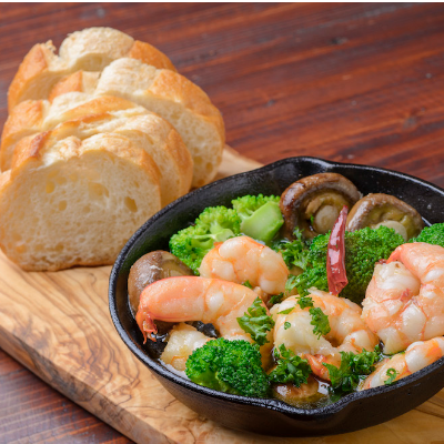 - にんにくの香りが出てきたら、えび、マッシュルームを加えて中火で煮て、塩ゆでしたブロッコリーを加える。