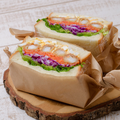 - えびに小麦粉、とき卵、パン粉の順につけて、180度の油で揚げる。粗熱が取れたらソースをかける。