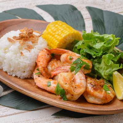 - フライパンにオリーブオイル大1、にんにくを入れて、弱火で炒め、香りが出てきたら、薄く粉をふったえびを中火で炒め、パセリを加える